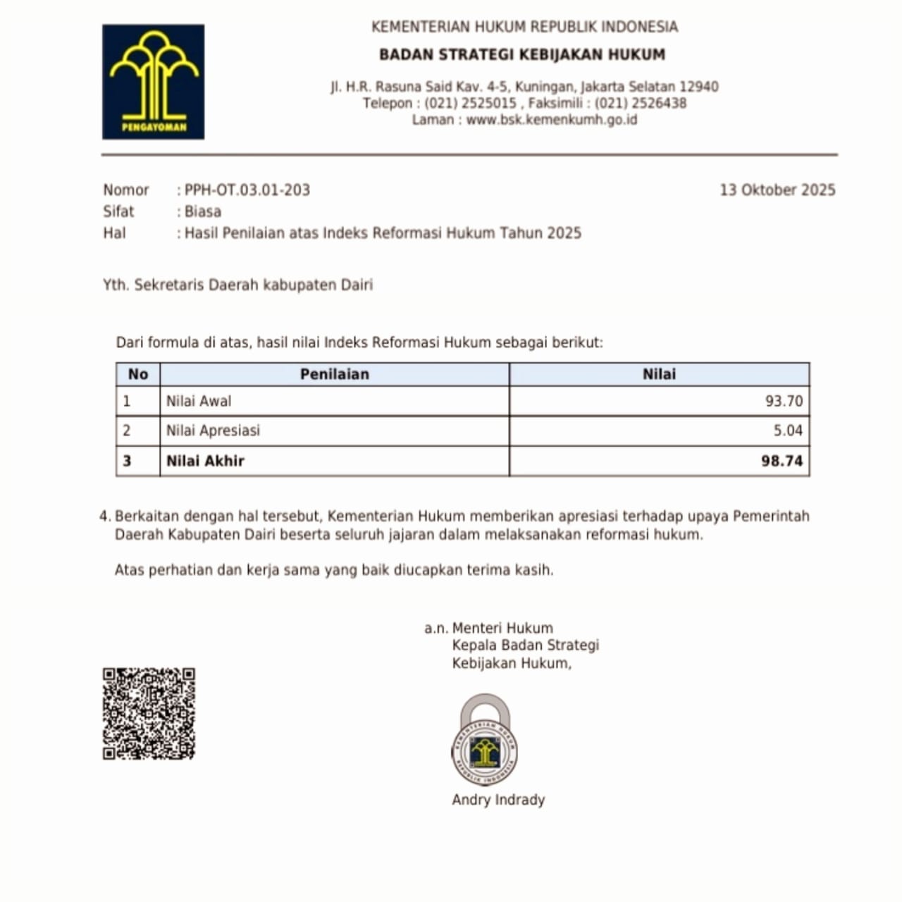 Pemerintah Kabupaten Dairi raih kembali predikat AA (ISTIMEWA) dalam penilaian Indeks Reformasi Hukum (IRH) Tahun 2025 dari Kementerian Hukum Republik Indonesia.